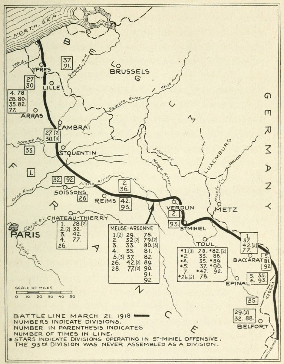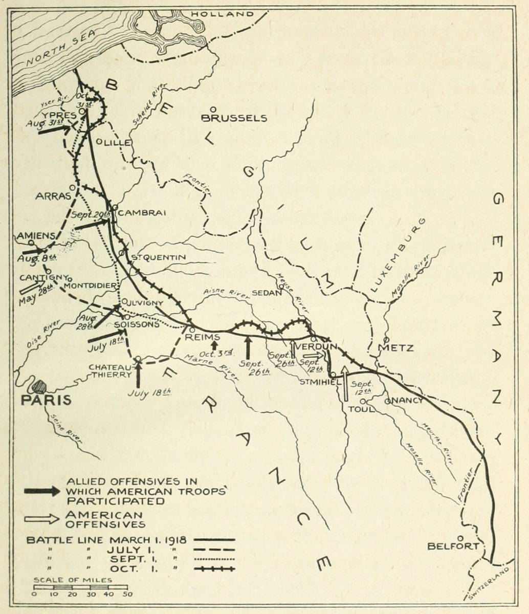 There are many disputes between divisions as the result of a proud and natural rivalry, which was possibly too energetically promoted by the staff in order to force each to its utmost before it staggered in its tracks from wounds and exhaustion. One division might have done the pioneer hammering and thrusting which gave a succeeding division its opportunity. A daring patrol of one division may have entered a position and been ordered to fall back; troops of another division may have taken the same position later. There was nothing so irritating as having to withdraw from hard-won ground because an adjoining unit could not keep up with the advance. Towns and villages were the landmarks on the map, with which communiqués and dispatches conjured; but often the success which made a village on low ground tenable was due to the taking of commanding hills in the neighborhood. Sometimes troops, in their eagerness to overcome the fire on their front, found[ix] themselves in the sector of an adjoining division, and mixed units swept over a position at the same time. In cases of controversy I have tried to adjust by investigation and by comparing reports. I must have made errors, whose correction I welcome. To illustrate the full detail of each division's advance would require several maps as large as a soldier's blanket. The maps which I have used are intended to indicate in a general way the movement of each division, and our part on the western front in relation to our Allies.