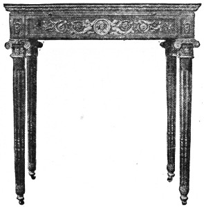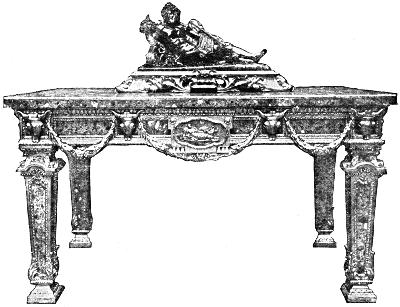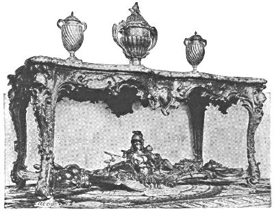 The English court vied with France in its extravagance, and heaped honors and wealth on the man who, like Boulle, in France, was foremost among designers of furniture in that country. The authorities on fine furniture frequently speak of Marot’s work in connection with that of the great Boulle. Daniel Marot was the son of Jean Marot, an architect and engraver. After he went to England with William III he principally concentrated his talent upon the adornment of Hampton Court Palace. Much of the furniture at Hampton Court bears unmistakable traces of his authorship. At Windsor Castle also there is a silver table that is attributed to him.