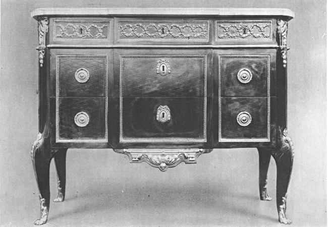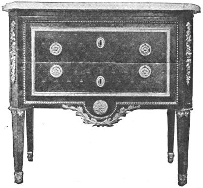 The ormolu takes new forms. It is limited to the edges and to frames of panels, to friezes, and to important centers, and follows the classic spirit: not an outright imitation of Roman or Greek forms, but a charming French interpretation of the antique. The designs of the metal worker had never been more delicate, or his execution finer. Delicacy and appropriateness of ornament, fineness of proportion, and sobriety of treatment were the ideals of the new cabinetmakers. The art of marquetry was still further advanced, and reached perhaps its culminating expression in the fine examples of Riesener and Röntgen.