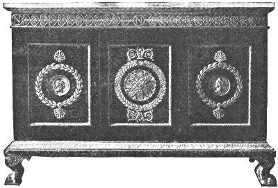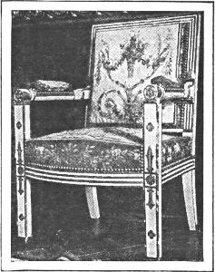 Ormolu was no longer employed in an architectural manner in which one decorative detail is set off against another in a play of rhythm and contrast; but was applied as single figures or small ornamental motives on a plain surface of mahogany. Oftentimes this ornament has so little relation to the space decorated that it could well be omitted without loss of real effectiveness. This enthusiasm for the antique passed through Egyptian, Greek, and Roman phases. Heavy and unimaginative as most of the Empire pieces seem, it can at least be said that they are more consistent and satisfying than the inharmonious mixture that characterized the furniture of the last year of Louis XVI. Many of the Empire chairs indeed are of real dignity and beauty of proportion. In some of these ormolu, introduced for the first time in chairs, was used in combination with polished mahogany; but in most cases the woodwork was sparingly carved with rosettes and enameled in white and gold. For the coverings, silk brocade and appliqué in the prevailing colors of yellow and red took the place of tapestry.