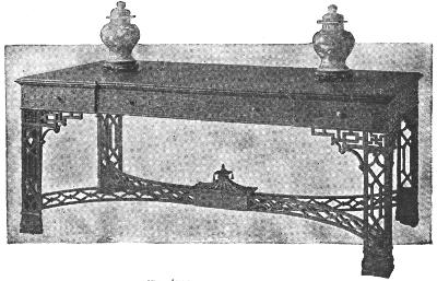 Chippendale’s styles represent many influences. His early work was patterned closely upon Queen Anne models; but with the “Director” appeared many examples of Gothic and fretted furniture. The Gothic, unsuitable as it was for domestic use, obtained little vogue; but the ornamentation of chairs and tables, either by open or, more commonly, applied fretwork, was popular for a dozen years or more, and is characteristic of some of Chippendale’s most successful if not most showy productions.