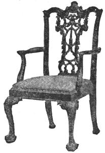 The “Director” contains many designs that are fantastic, and many that are difficult and even impossible to execute. Fortunately Chippendale’s fame does not rest upon these designs, made to catch the eyes of his richer patrons, but upon the pieces actually made, and it is refreshing to see how much finer are these latter, evolved by the trained craftsman, understanding every limitation and every possibility of his material. Chippendale’s chairs represent by far the best expression of his genius. Starting with the modified Dutch forms introduced by William and Mary and Queen Anne, in which the cabriole leg with ball and claw feet and the flowing curved back with solid splat are the prominent features, he soon developed an individual style marked by great dignity, strength, and originality. His earliest chairs are perhaps the finest. In these the cabriole leg is always employed, and the side frames of the back curve outward as they run up to more or less pronounced ears at the top. The top rail takes more or less of a cupid bow shape, and the central splat fills in the inclosed space. It is in the design of these central splats and the inclosed framework that Chippendale is at his best. The almost inexhaustible variety of figure in these pierced and interlaced centers, always in the happiest relation to the framework, gives the principal interest to these chairs, and stamps Chippendale as one of the great masters of design.