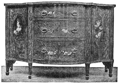 To Heppelwhite we must also give credit for the most refined and tasteful use of inlay and of veneers to be found in English furniture. On the doors of wardrobes and on the front of drawers he employed veneers of the beautiful curl mahogany that came into favor about 1760, and on the front of his solid mahogany tables, sideboards, and bookcases he substituted for carving the inlay of low-toned colored woods in the form of lines and narrow bands and other ornamental motives.