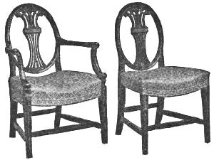 The most characteristic designs of Heppelwhite are his chair backs. These are commonly shield or oval shaped, with open center splats, in the center of which were often introduced the ostrich plumes of the Prince of Wales. Another form of back frequently employed by Heppelwhite was that with slightly curved sides and strongly bowed top, known as the “camel back.”