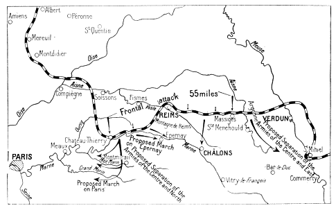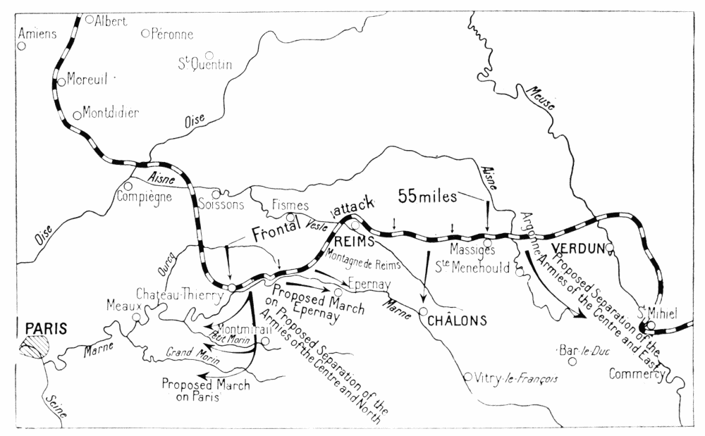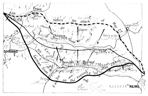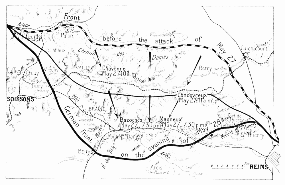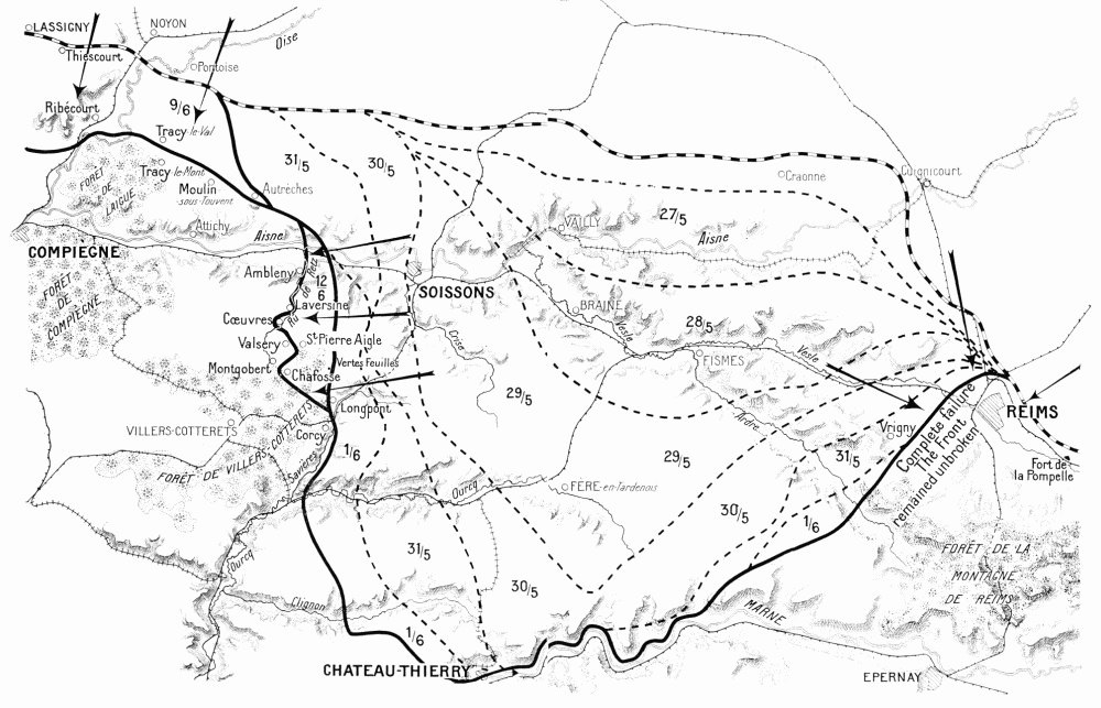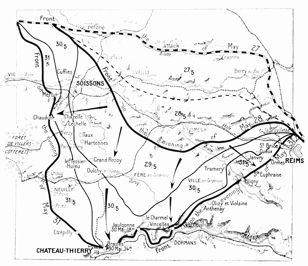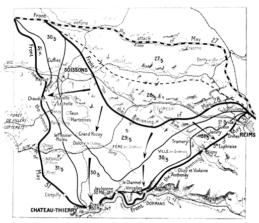 Before attacking the British again, Ludendorff attempted to draw the French reserves southwards, his plan being to wear them down and then settle with the British alone. Hence the attack of May 27 on the Aisne front, which was powerfully organised on the German side owing to the great advantage they possessed in being able to bring up rapidly their heavy artillery from the Somme. Moreover, the ground was familiar to the enemy, who likewise knew that this part of the Allies’ front was only weakly held. The Allies’ reserves being insufficient to cover the entire front, and considering that the German offensive might be launched against either the Lys, the Somme, the Oise, or the Aisne fronts, Foch had concentrated his forces at the vitally important points covering Paris, the channel ports, and other positions less easy to defend than the Chemin-des-Dames.