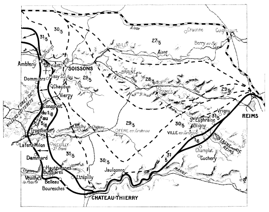 From June 5, five more divisions were engaged, making a total of forty-seven divisions, or the equivalent of about sixty French divisions (German regiments having three more companies than French regiments, and divisions one more regiment). The enemy order of battle between the Oise and Rheims on May 27, extended along three zones of attack—a central zone, from Leuilly to Berry-au-Bac, which was the principal sector of attack, and two secondary zones on the wings—between Pontoise and Leuilly to the west and between Berry-au-Bac and Rheims to the east.{5}