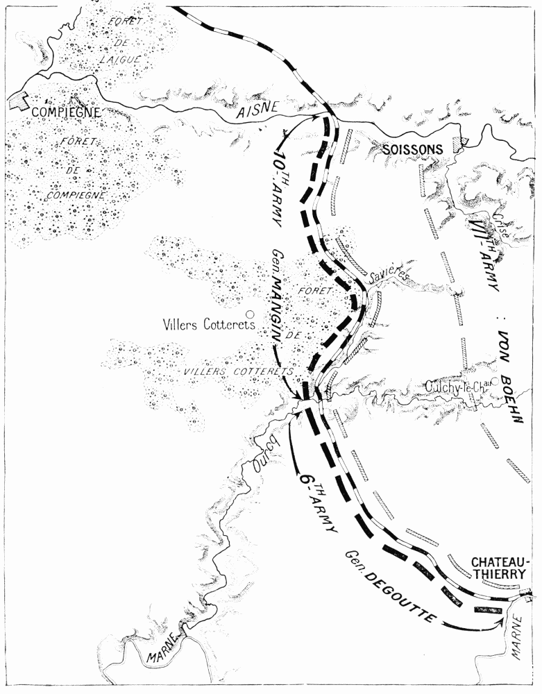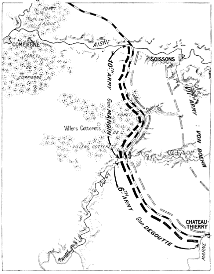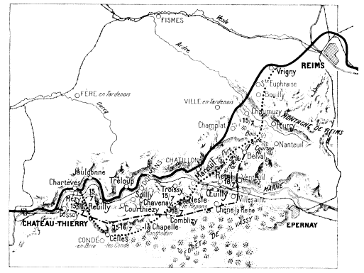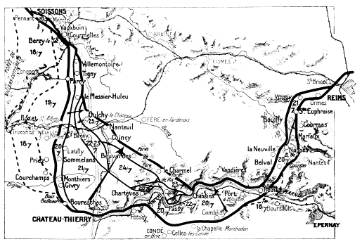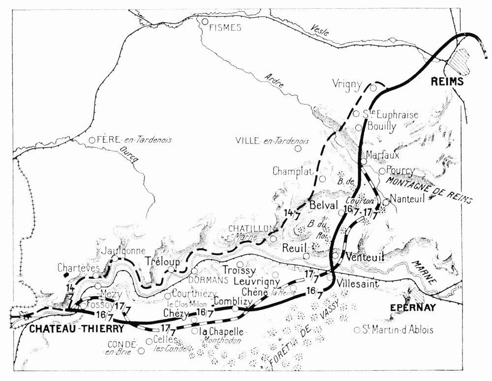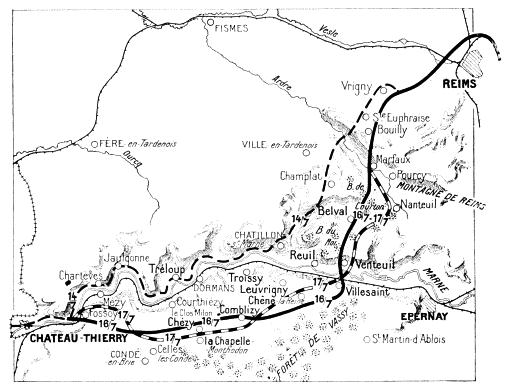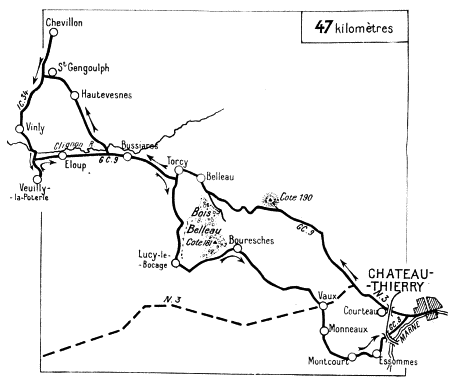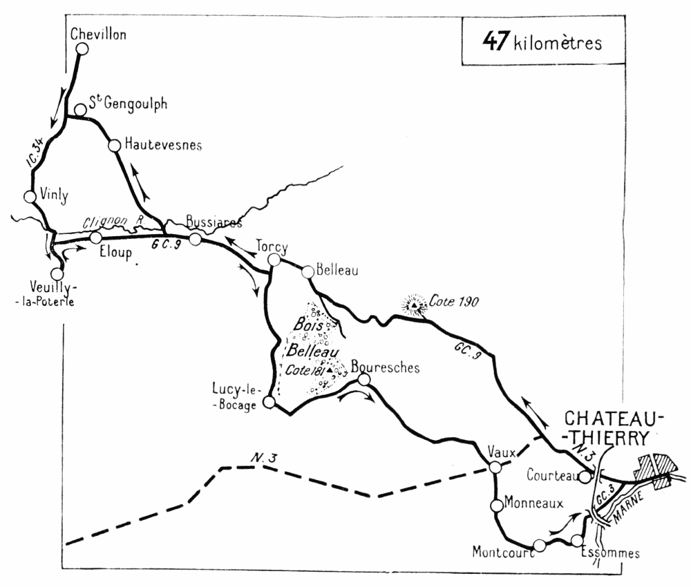 On June 1 the Germans tried to get a footing on the heights on the south bank of the Marne. It has been seen that they were unable to cross the river at Château-Thierry, the bridge having been destroyed. At Jaulgonne a battalion of the 36th succeeded in crossing, on the nights of May 31 and June 1, only to be thrown back on the other side, or captured by Franco-American troops on the 2nd. On the 3rd the Germans gave up the attempt, and things quietened down in this sector, which the Americans continued to guard.