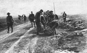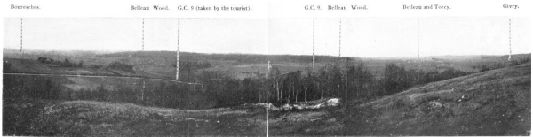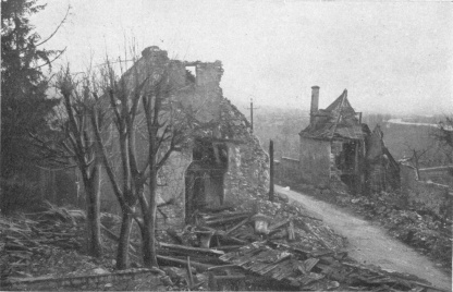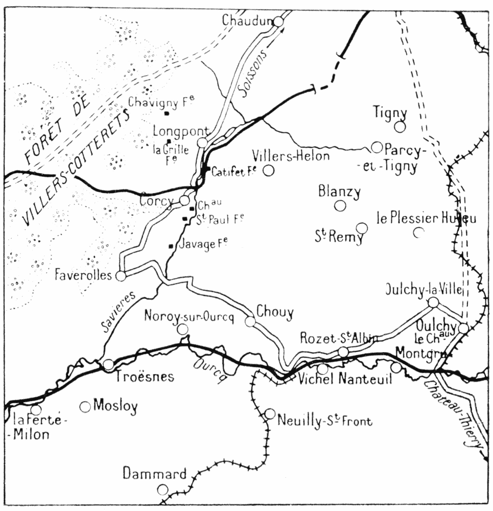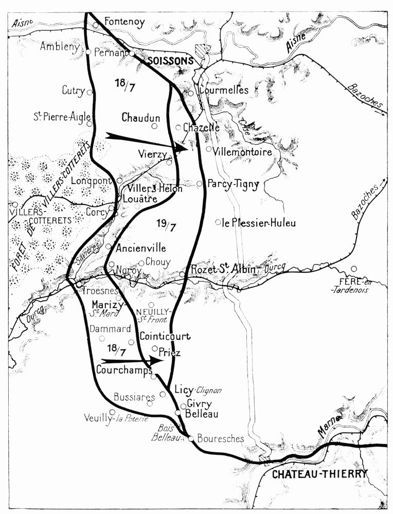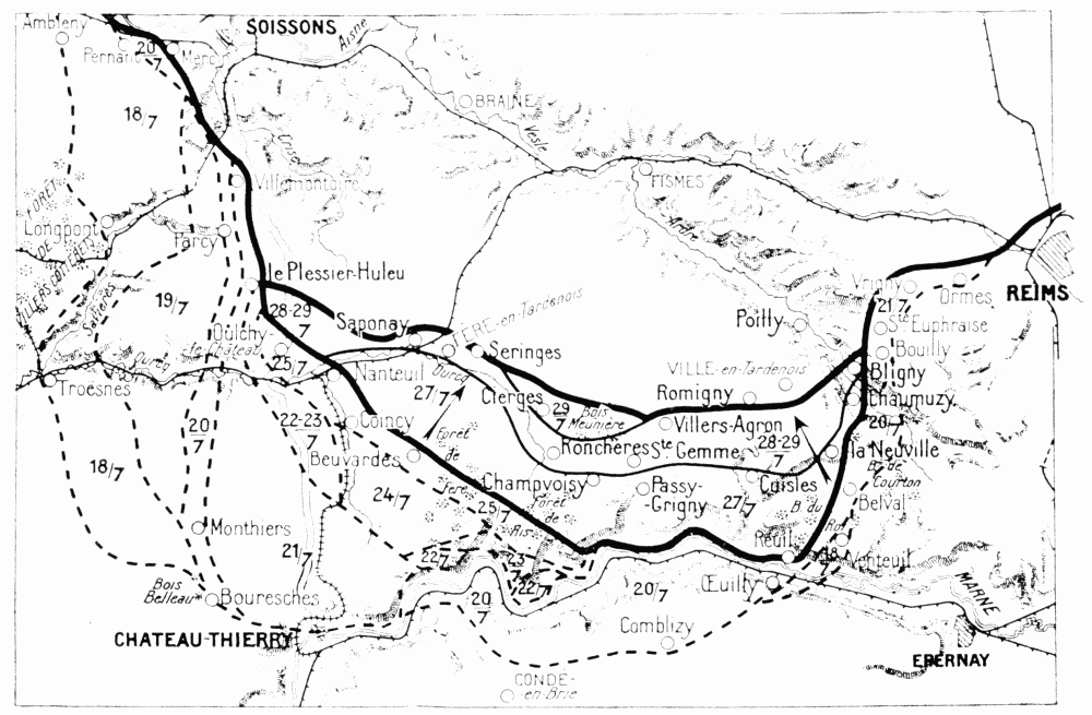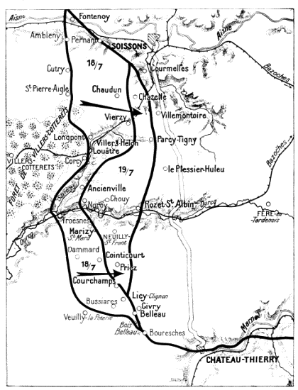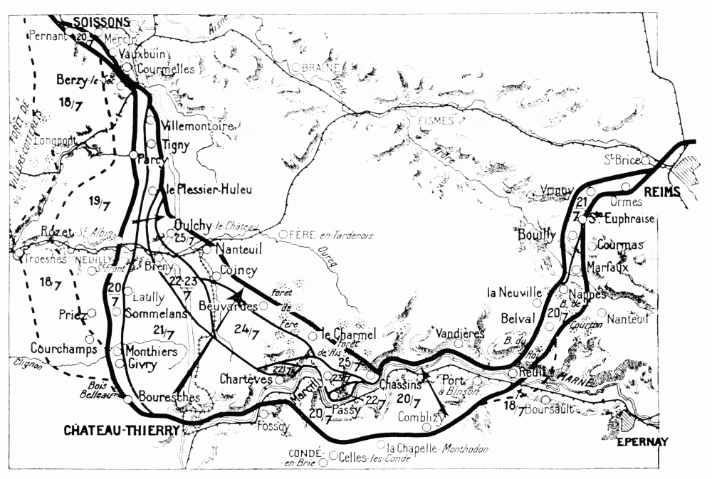The fighting was extremely fierce throughout this region. To save their guns and organize their retreat the Germans stubbornly opposed the American advance. However, foot by foot, they were obliged to give way before the impetuous onrush of the Americans. From the 23rd to the 26th the latter, after a prolonged struggle, captured Charmel and the whole of the heights running parallel to the Marne. The German prisoners captured in Ris Wood declared that their orders were to hold out at all costs, to allow of a counter-attack by two divisions of the Guards. On the succeeding days{126}