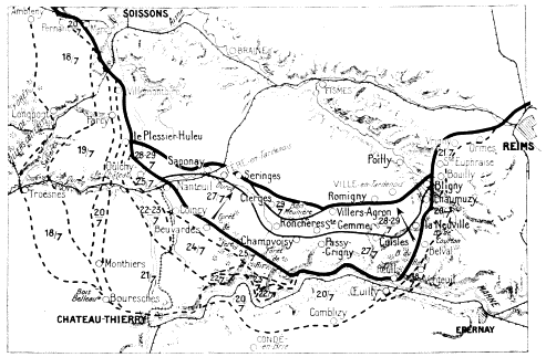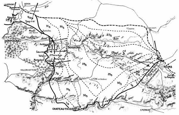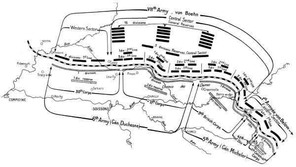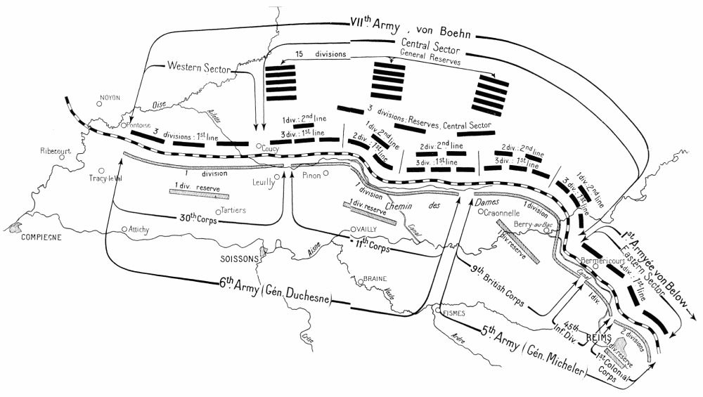 Forty-two divisions under Generals von Boehn (7th Army) and Von Below (1st Army) were concentrated between Pontoise and Berry-au-Bac and between Berry-au-Bac and Rheims. In the centre, where their principal effort was to be made, the Germans massed twenty-eight divisions of picked storm-troops trained in the new methods of attack. Of these twenty-eight divisions twenty-three previously formed part of General Von Hutier’s famous “Army of Attack” which, in March, had broken through the front of the Fifth British Army on the Somme. Since the middle of April, all the picked divisions, except two, had been sent to the rear and intensively trained in view of the coming attack. All the first-line divisions, fifteen in number, knew the ground of the sector of attack, having fought there in 1917. The objective of some of them was the same as in the Battle of the Chemin-des-Dames in 1917.{4}