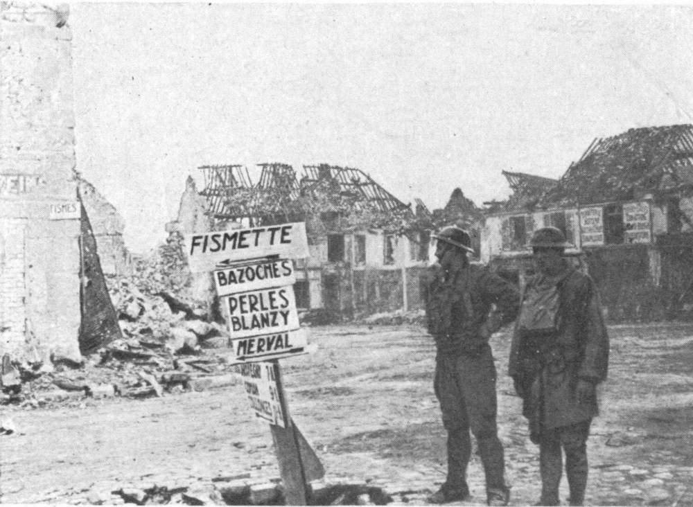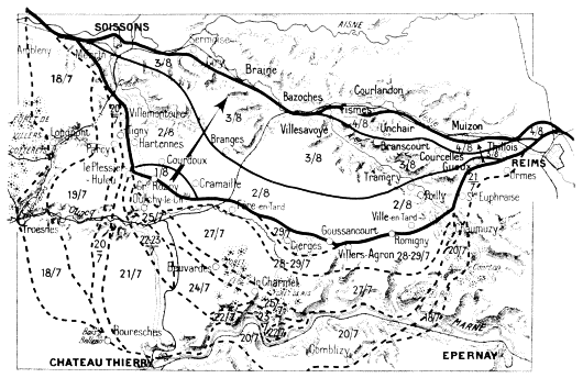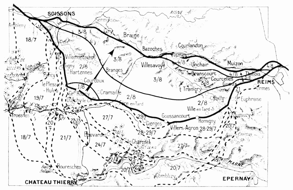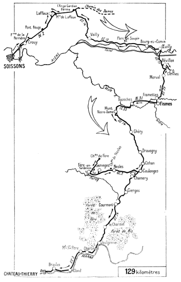 In the afternoon, the advance continued south of the Aisne, being more rapid in the centre than on the wings. The River Vesle was reached towards 7.30 p.m. in the neighbourhood of Bazoches and Magneux, Fismes, and Braine fell into the hands of the enemy.