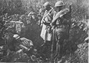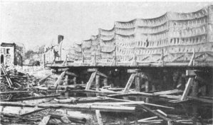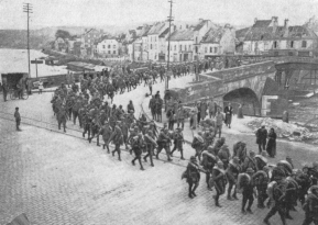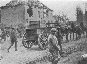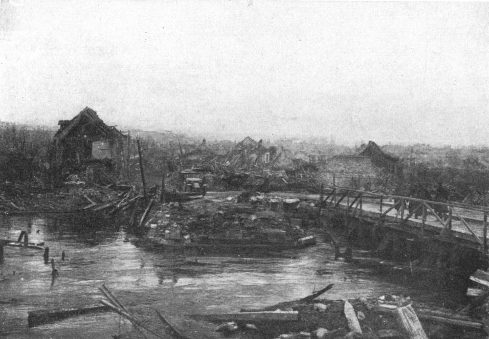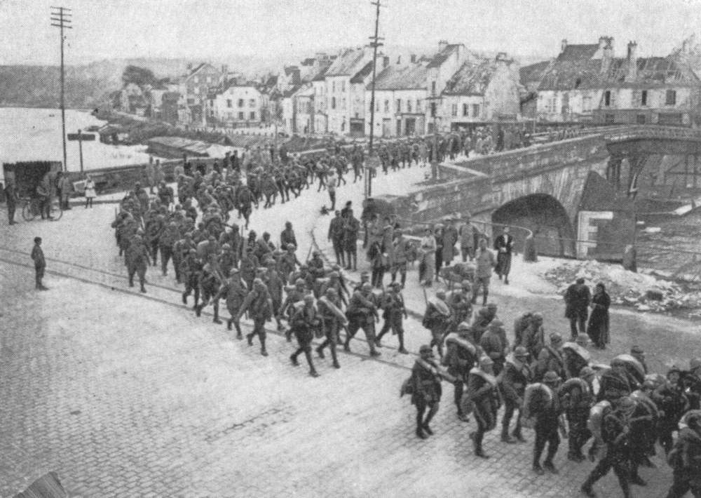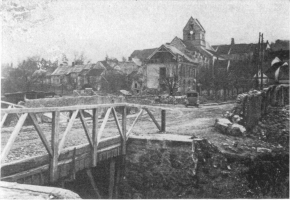 During the German “Peace Offensive” of July 15, the Americans (3rd Division) resolutely withstood the shock on the Marne. Behind a thick smoke curtain, and favoured by the night mists, German pioneers threw bridges over the river from Gland eastwards, along a twelve-mile front. About a dozen bridges, some of them 25 to 30 feet wide, were established. German engineers were particularly active in front of Mont-St.-Père, Jaulgonne, and Chartèves. At dawn, while the infantry were being taken across the river in boats and on pontoons worked by steel cables, the artillery crossed the bridges. French and American aviators, flying as low as 150 feet, raked the bridges and pontoons with machine-gun fire, while two of the bridges, struck by bombs, collapsed, throwing men, horses, and baggage into the river.