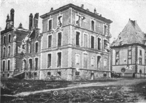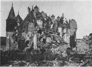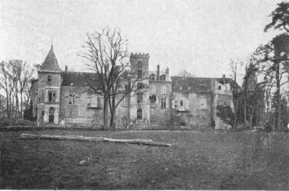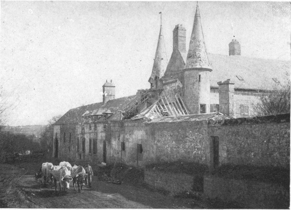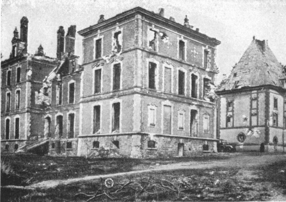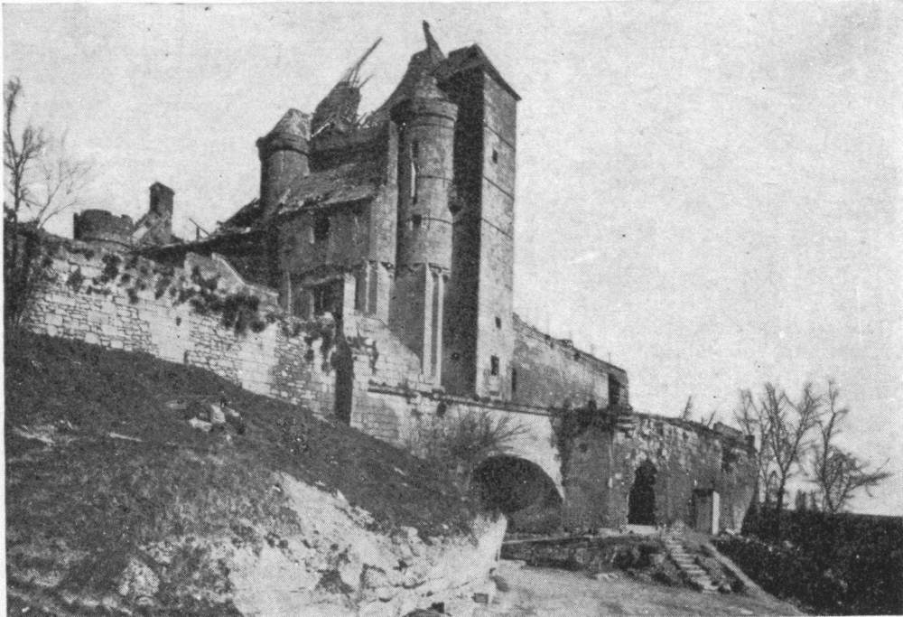 Before leaving the village, turn again to the left, then at the fork, 500 yards beyond the village, take the road on the right to Charmel. The road passes through a wood, cut to pieces by the shells. German artillery was installed there. At the other side is the road which leads to the Castle of Charmel, about 300 yards distant. The castle, which is magnificently situated, overlooks (to the North) the vast plain which spreads out between the extreme points of the Forests of Fère and Ris and (to the South) the valley of the Marne.