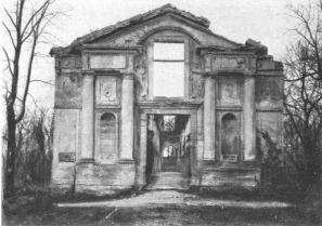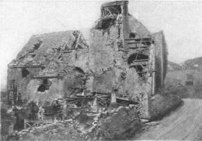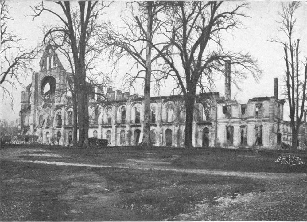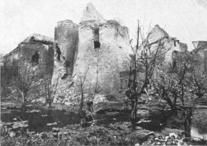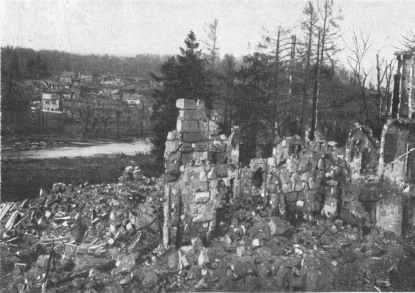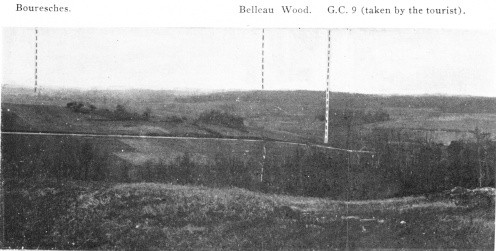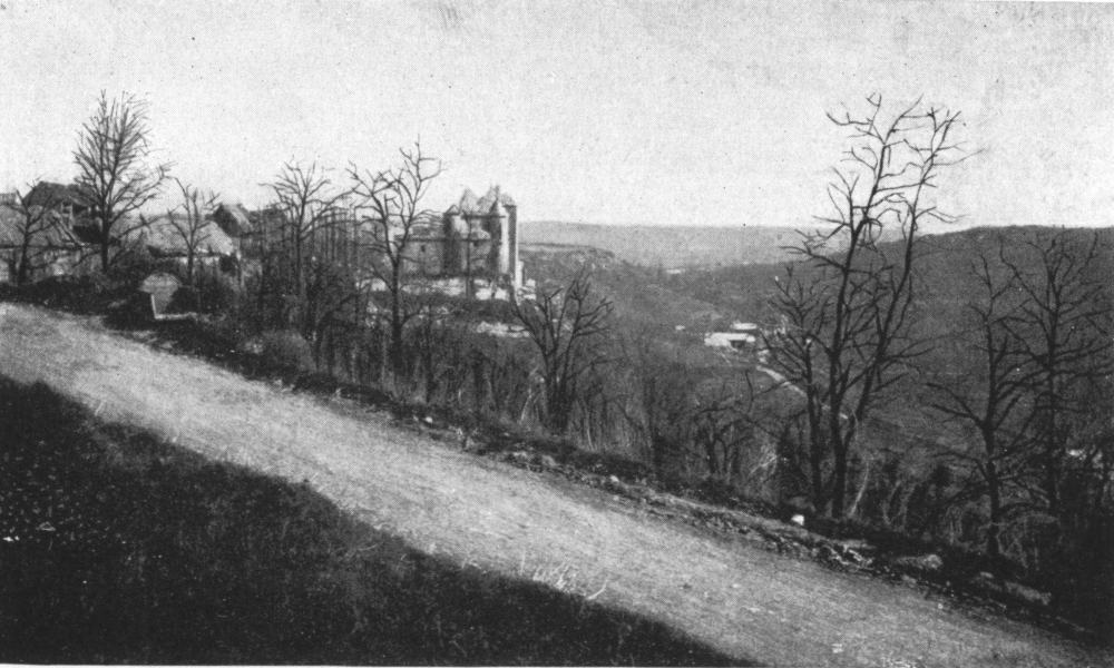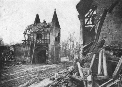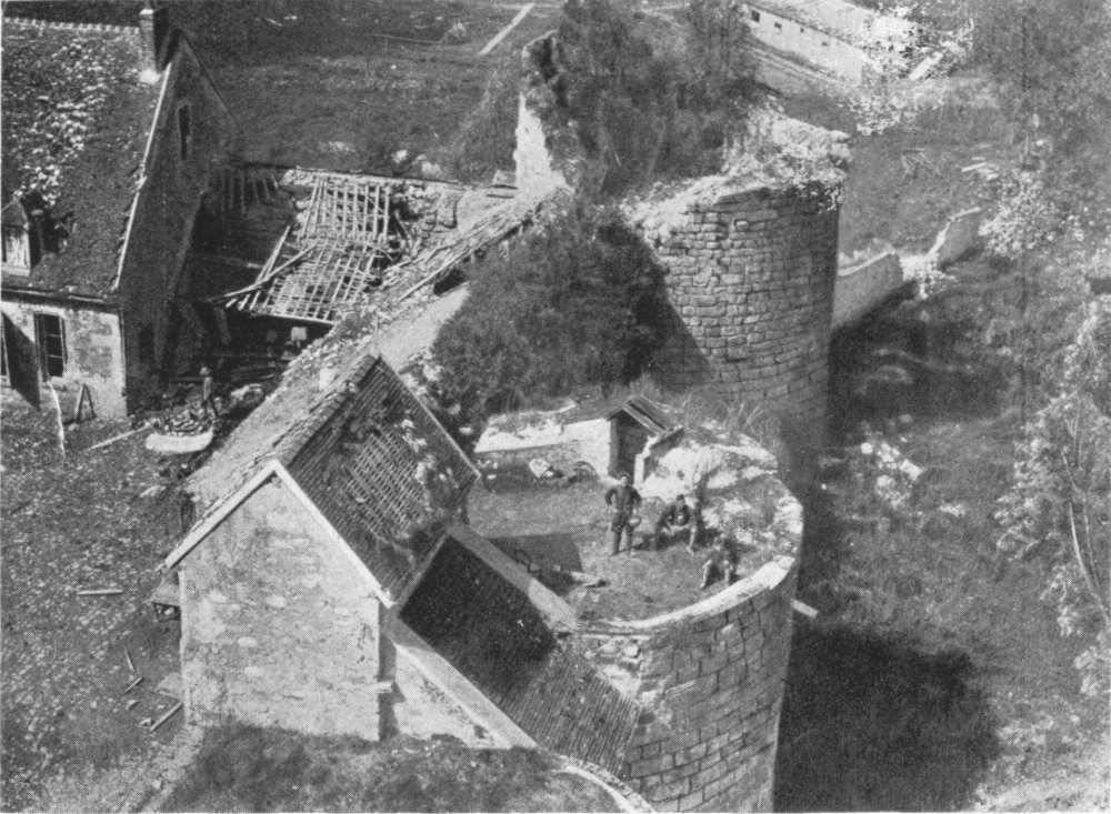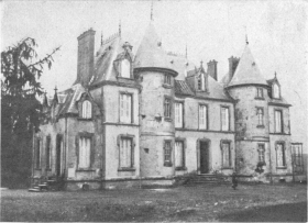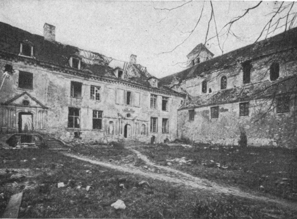Before leaving the village, turn again to the left, then at the fork, 500 yards beyond the village, take the road on the right to Charmel. The road passes through a wood, cut to pieces by the shells. German artillery was installed there. At the other side is the road which leads to the Castle of Charmel, about 300 yards distant. The castle, which is magnificently situated, overlooks (to the North) the vast plain which spreads out between the extreme points of the Forests of Fère and Ris and (to the South) the valley of the Marne.