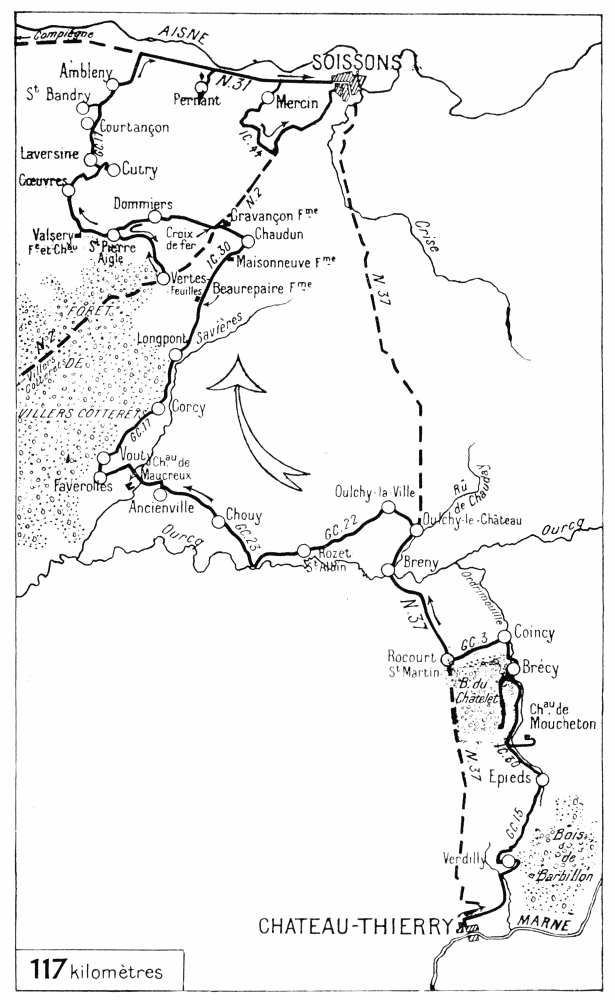 From Courmont to Jaulgonne the road runs between the woods of Fère (to the west) and Ris (to the east), in the middle of the region which the Americans conquered from July 22, 1918, onwards.