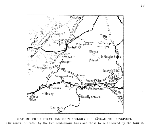 After admiring the view, the tourist should descend the hill on the side opposite; on reaching the Château-Thierry road he will find his car waiting for him.