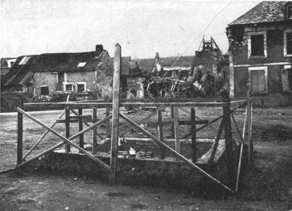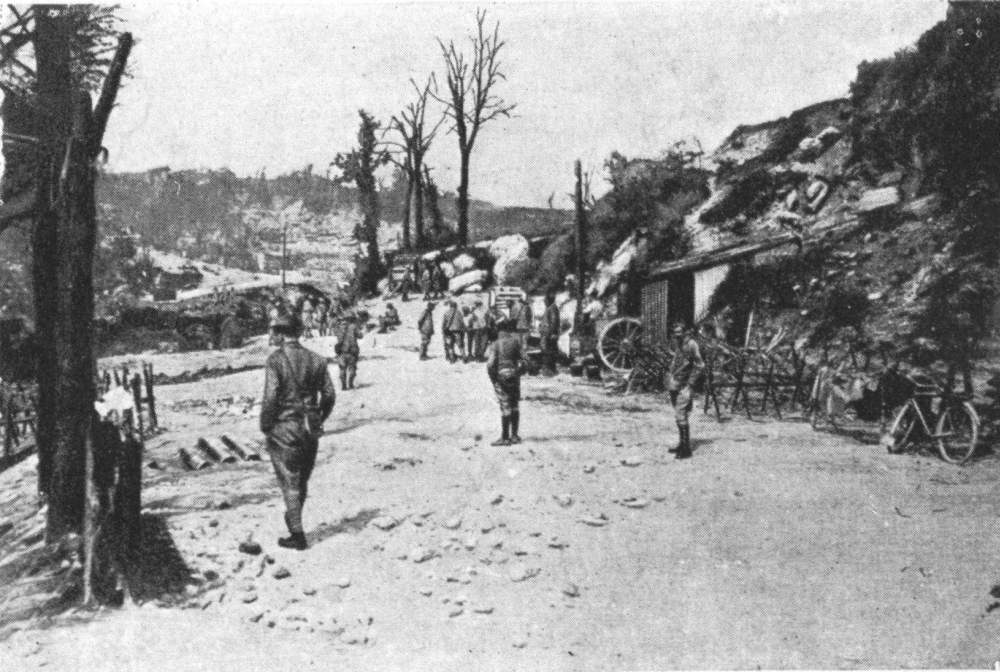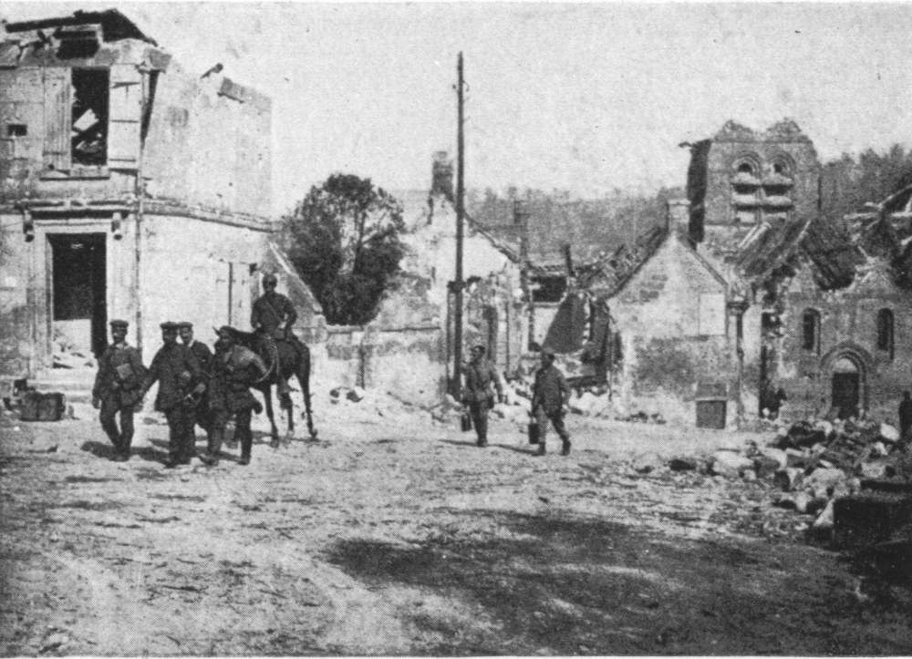 On May 28, 1918, the second day of the German Offensive, the German High Command changed its original plans, which were to limit the operations to the taking of the heights south of the Vesle, and then to cause the fall of Soissons and Rheims. The Franco-British resistance on the two wings, and the rapid advance of the Germans in the centre, caused the German High Command to attempt the thrust towards the Marne. From May 29 to June 1 the centre of the 7th German Army made a dash for the Marne. On the evening of the 29th the Kommandant of the 231st Division declared that it was a “question of honour to reach the Marne to-morrow.” Two second line divisions (the 231st and 103rd) were interposed between the 10th and 28th on one side, and the 36th and 5th Guards on the other. It thus became a race to the Marne between these divisions. On May 30 the 231st reached the river at about two o’clock in the afternoon, between Brasles and Mont-St.-Père, while the 28th entered Jaulgonne at six in the evening.{128}