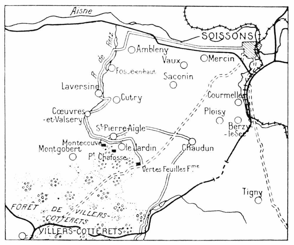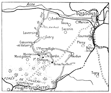On the 28th, at day-break, the Germans resumed their attacks with increased vigour, especially on the wings, where their success on the previous day had been less marked. To the west, the 30th French Corps, which had suffered heavily on the 27th, was reinforced by fresh divisions, with orders to cover Soissons, which was in danger of being encircled. This corps succeeded in checking the enemy to the north, on the Cuffiès-Crouy-Bucy-le-Long line, but on the right the Germans crossed the Vesle during the night, driving a wedge into the Murton Valley and advancing eastwards towards Soissons. Some of their advanced detachments reached the town, but were immediately driven out.