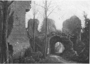 Mont-St.-Père.In the village, at the fork of G. C. 4 (on the right, leading to Epieds) and G. C. 3 (leading to Château-Thierry), take the former for about 200 yards to a road on the left, which leads to the top of the hill, where stand the ruins of the church (photo p. 126) and castle. Leaving the car, which should return to the Château-Thierry road and wait at the exit of Mont-St.-Père, at the point where the lane from the Church of Mont-St.-Père rejoins the road to Château-Thierry, the tourist should go on foot to the church and castle.