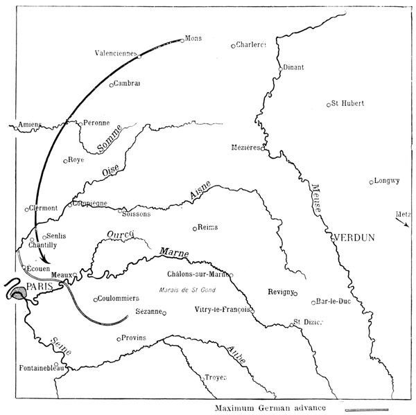 The temptation to push straight on to the long-coveted capital must have been very great for the German High Command. However, in view[Pg 6] of the danger presented by the Franco-British forces, which were still unbroken, it was eventually decided first to crush the Allied armies, and then to march on Paris, which would fall like 'a ripe pear.'