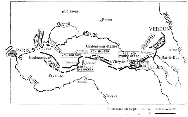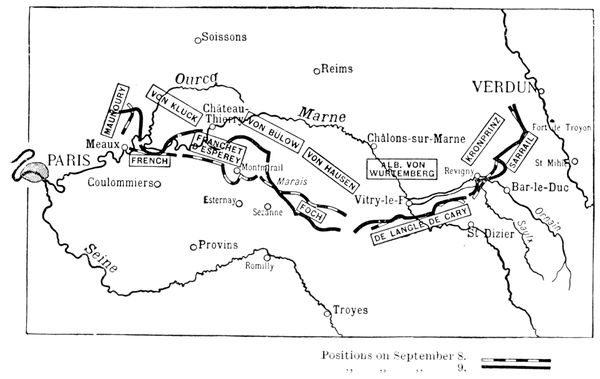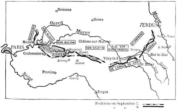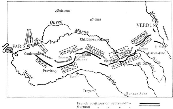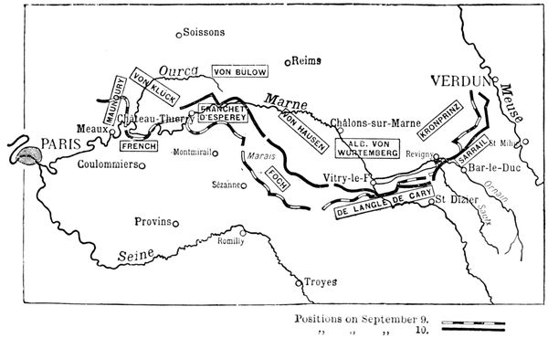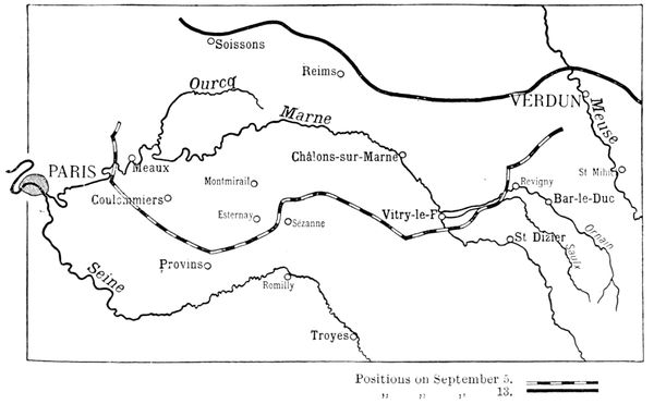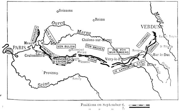 The map before you shows the respective positions occupied by the opposing armies on September 5, 1914, the eve of the great battle. The Allied forces are represented by a thick black line, those of the Germans by a black and white line.