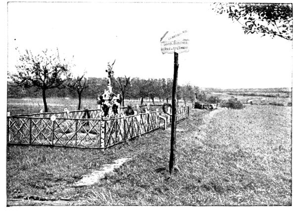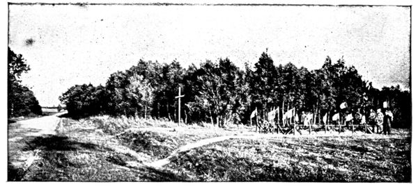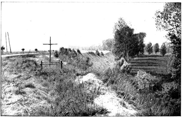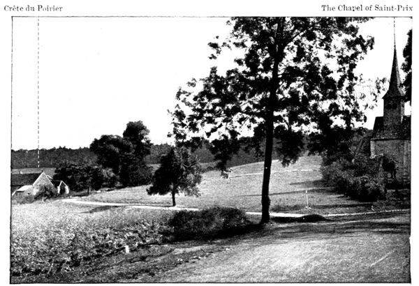 Leaving Heippes church behind, I. C. 24 leading to Saint-André comes into view on the left. This road formed the pivot of the attacks of the 75th Division, one part of which was operating to the south, with the 65th Division in Ahaye Woods; the other to the north in the Woods of Châtel and Moinville. After a fierce struggle the reserve divisions were forced to retire. Whilst the 65th Division clung for a time to Hill 342 or the Signal d'Heippes, which commands the village to the south-west beyond the railway, the 75th held out in Heippes, but on the 10th both were driven back to the east of G. C. D. 6.