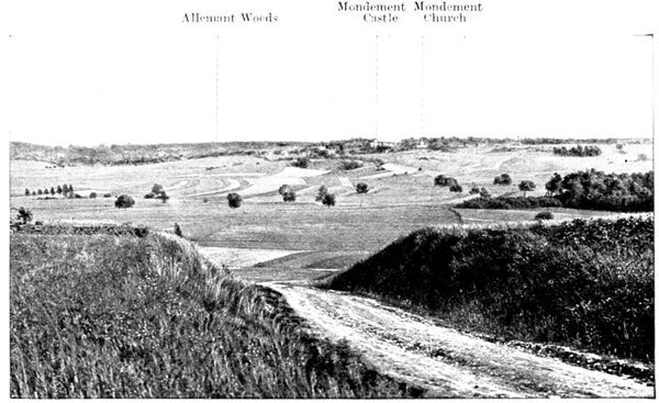 Still following the valley, we reach Rignaucourt (33½ km.). To the north of the village, on the plateau, is Blandin Wood, which was occupied until September 10 by the 65th (reserve) Division. From there it hurled its daily attacks to the west against the flank of the enemy. On the 10th it was thrown back violently to the south-east, beyond Landlut Wood, which crowns the plateau to the south, and lies to the right of the road. The German retreat took place on the night of the 12th.