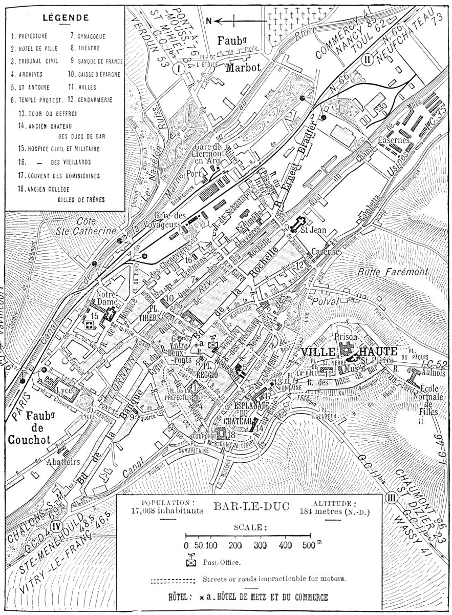 At the junction with N. 3, shortly after passing the spot where the railway crosses the road, turn to the right in the direction of Verdun (63 km.). This town and its entrenched camp, whose renown has become worldwide, are the subject of a special volume.