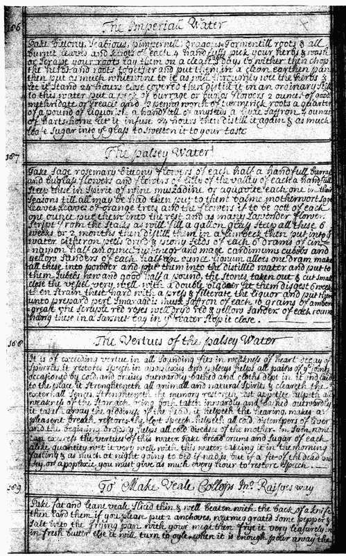 Take Rue, Agrimony, Celandine, Sage, Wormewood, Balme, Feaverfue, Mugwort, Tormentil, Marygold flowers, Cowslip flowers, Pansie flowers leaves and all, Carduus, Angelicoe, Dragons, Pimpernel, Rosemary, Scordium, Purple wort, Burnet, Enul campane roots, of each of these halfe a pound shred small, then take Anniseeds, Carraway, Coriander, Cardamome, of each of these two ounces bruis’d, bruise alsoe your Enul campane roots, then steep all these in an earthen pott in two quarts of white wine and a gallon of ye best Canary, mixing them well in ye liquor, so let it stand till ye next day, then distill it in an ordinary still close stop’d, still it as soon as you can keeping it close stop’d whilst it steeps and whilst you still it, stirring it when you put it into ye still, soe keep it for your use.