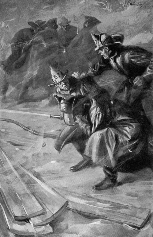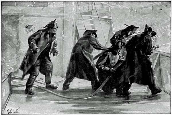 Moore ordered Farley to go below decks and warn Captain Keighley and[Pg 17] the squad in the hold. Farley glanced at his fellows; they were all partisans of the captain; they had been chafing under Moore’s attacks on him, and they were contemptuous of the lieutenant for the way in which he had mishandled the pierhouse blaze. Moreover, there were only four of them to two lines of hose; and the one unnecessary man there, as they saw the situation, was Moore. Let him go himself.