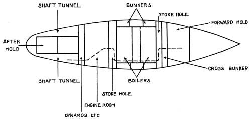 | Dotted line shows passage of Keighley’s men from forward cargo room to shaft tunnel. They finally escaped through bunkers amidships beside the boilers and stoke holes | 50 |