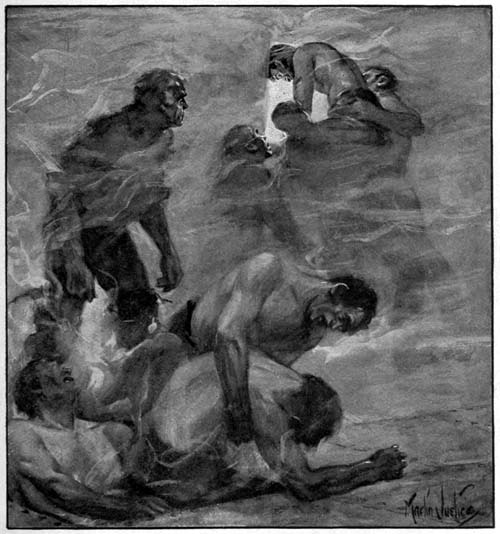 If “Shine” did not know, it was not long before he learned. He and Cripps had come as far as their hose would allow them when the first of the big white beasts, attracted by the splash of water, came shouldering along the passageway with its mouth open, panting. “Shine” raised a vainglorious whoop and put the hose on it. It rose on its hind legs to take the water, and it went over on its back in a deliciously cool bath, pawing at the stream that struck it rather too heavily for play. It rolled over, fighting, and came to all fours with a growl. The water struck into its eyes and into[Pg 258] its open jaws; it dodged blindly, biting less playfully; it began to wrestle and roll about, fighting in on the stream.