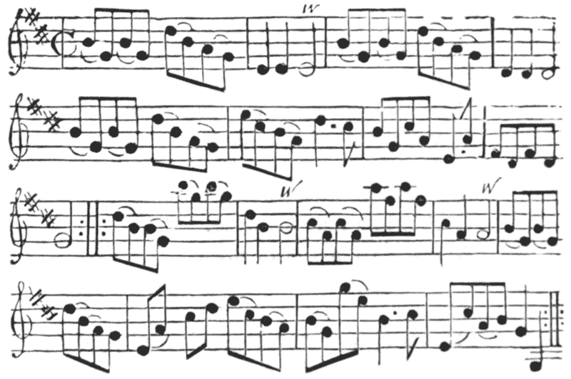 This ebook transcription includes five midi format audio files, which permit listening to a representation of the music printed in the original book. A midi file is not a recording of audio. It is instead a set of instructions that are interpreted by your own software, so that what you hear may be different from what the transcriber heard. Sadly, many e-reading devices that use the epub or mobi e-book format don't support links to external files, which means that readers using such devices won't be able to conveniently hear or download the mobi files. In that case, the html edition of the ebook must be consulted. Also, some html browsers don't automatically play MIDI files when the link is clicked. The user may have to adjust some browser settings, or install a plugin, or if the click downloads the file, then just go find the downloaded file and open it.