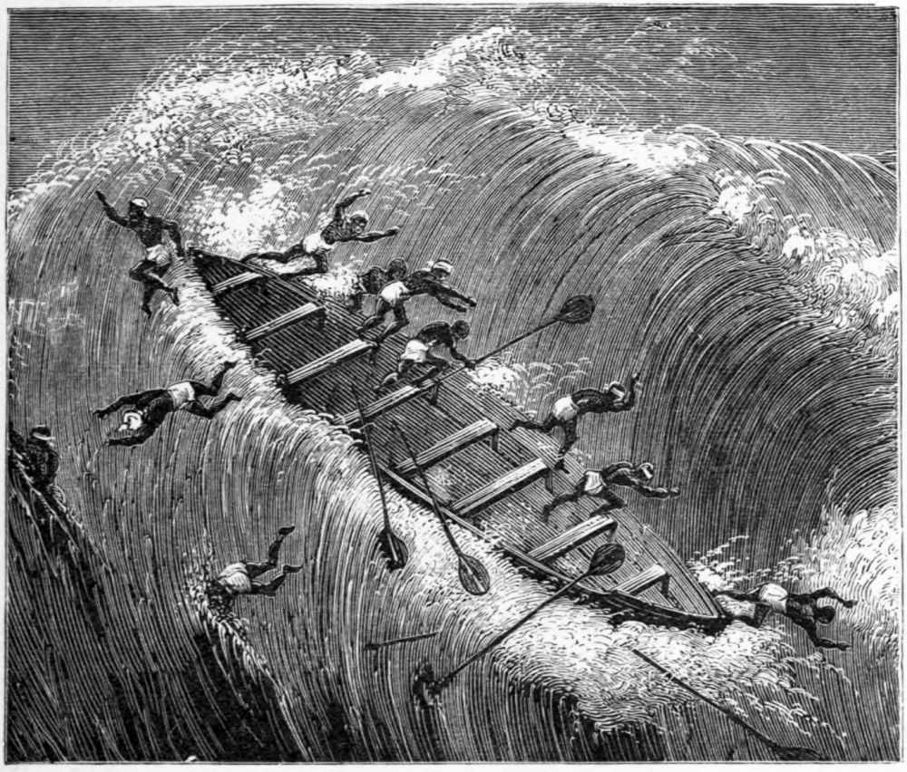 I was dreaming that I was on board the Petrel when{323} she was struck by a squall, and losing my footing had rolled down into the lee-scuppers; and I woke to find that the canoe was pitching about in an angry and confused sea, and that I had been rolled from where I was sleeping to the other side of the poop. I at once got hold of the rail and, raising myself up, looked round. Not a star was visible now, and a heavy breeze blowing had caused a nasty cross-sea to rise. Of the other two canoes I could see nothing; and our own was shipping a good deal of water, keeping four or five men constantly at work baling, while the slaves were lying about moaning and bewailing their unhappy lot, and suffering from all the miseries of sea-sickness.