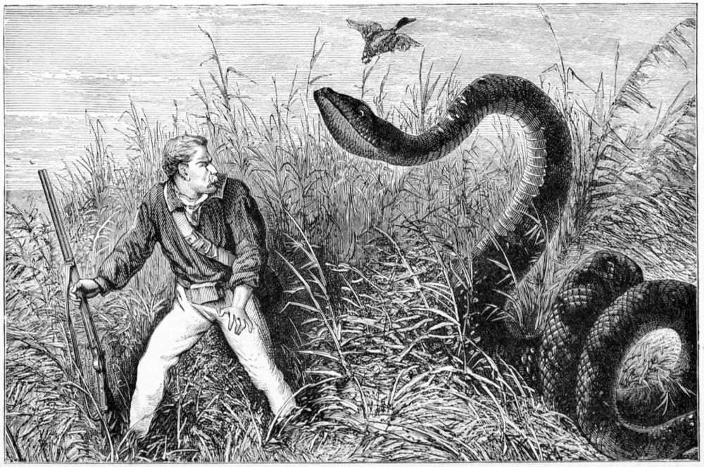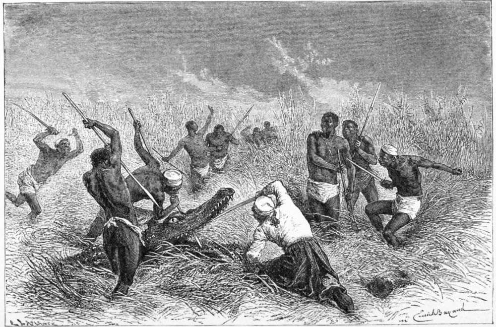 I was up to my waist in mud and water, picking the pods off the water-lilies, when I heard a scream and a crash, or more properly a crash and a scream, and I heard the voice of a man crying out, “Franki, Franki! mbogo, mbogo!” (buffalo, buffalo). Pushing through the reeds I saw one poor fellow on the ground gored by a buffalo, while another, though only armed with a shoka, or hatchet, was preparing to attack the infuriated animal.