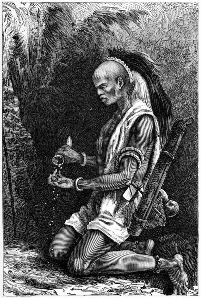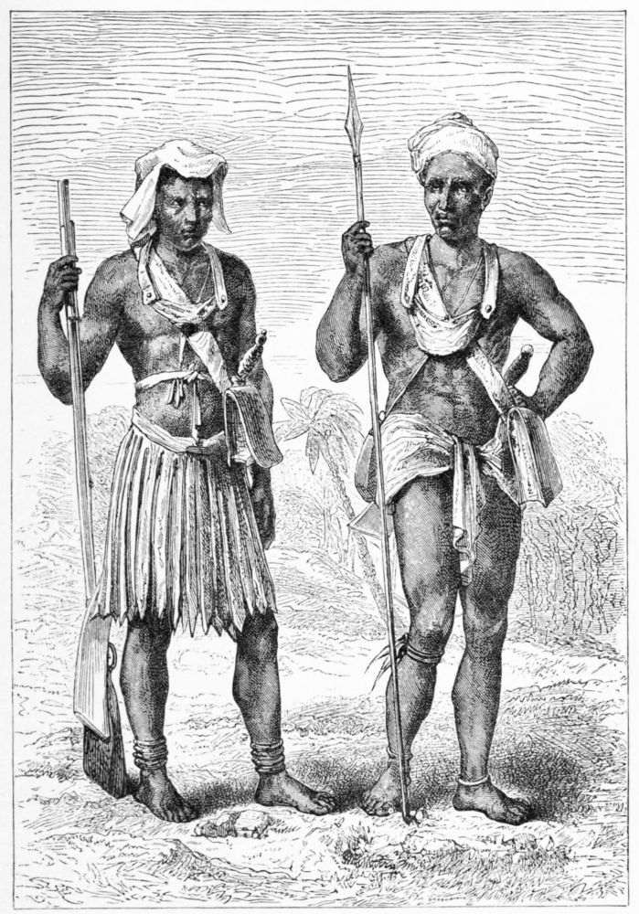 With these fellows, however, we had to give in to their customs of the road; and the road to be taken and the places at which we were to halt were all laid down by the kirangosi, or leader. He marched at the head of the caravan, carrying his load like the rest, and decked in a fantastic manner with beads and feathers, and wearing when coming near a village a robe of scarlet baize, which was his right, in addition to the{333} wages of an ordinary porter. Besides this he was entitled to the head of every animal killed in the caravan, and the heads of fowls, goats, and of any game we shot were all scrupulously demanded by him, and after some process of cookery devoured by him and his companions.