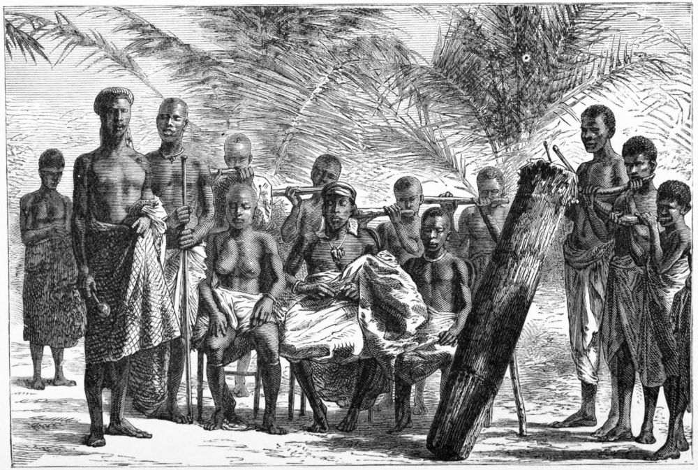 [A] Marimba are instruments formed of a number of keys of very hard wood, arranged on a frame under which are secured a number of gourds of various sizes. They are played on with two small sticks, and are much more pleasant to hear than most of the instruments of savages.