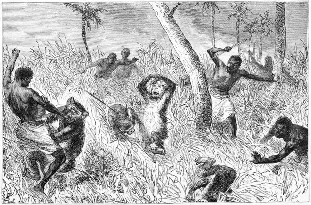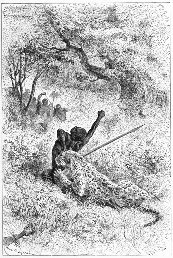 The beast rolled over in agony, dragging me with him, and I was in momentary fear of being crushed under his body. But aid was at hand, for Hatibu and{350} Bilal came rushing up with their guns, accompanied by men armed with spears, and in less time than it takes to write about it the animal had received the contents of both muskets and was riddled with spears. His death was almost instantaneous, and I was saved from my perilous position; but the poor fellow who had been first attacked received mortal injuries, and breathed his last before we could carry him into our camp.