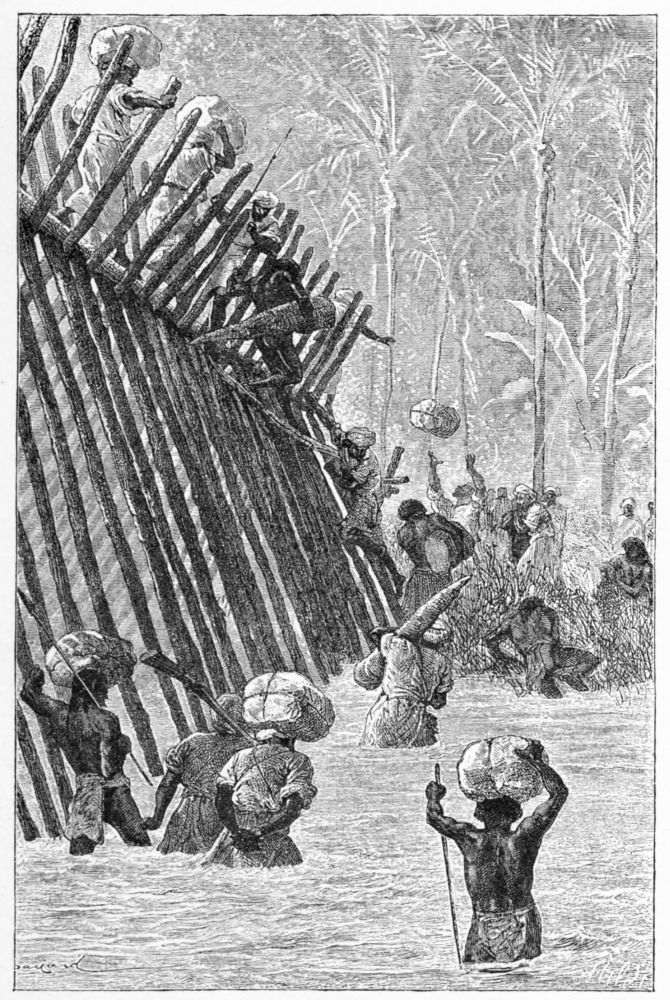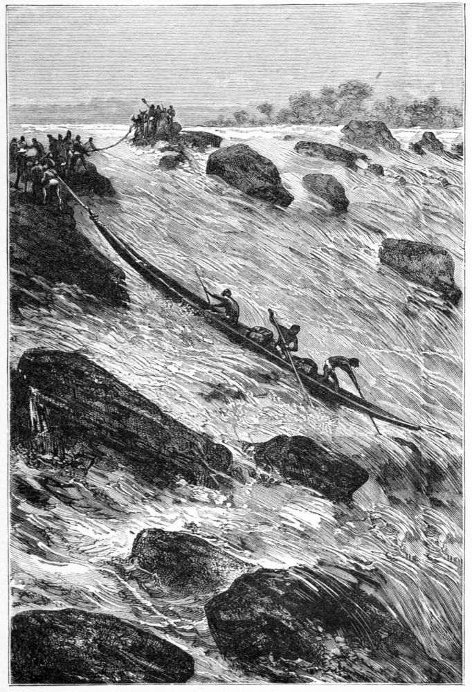 With much ado and trouble we got the canoes launched, and then found that the two built-up ones wanted calking, and had to be hauled ashore again. I was astonished now to see Hatibu, Bilal, and other Zanzibar men at this work. They did it well, using raw cotton, which, when water gets to it, swells exceedingly and makes the seams stanch and tight. All having been prepared, we embarked all our ivory and the greater portion of our slaves, who were dreadfully frightened at going on such an expanse of water as Tanganyika, though they were by no manner of means bad hands in the smaller canoes they were accustomed to on their own rivers. We gave the remainder to the chief who had been in charge of the canoes for the care he had taken of them, and also to pay for men to assist in pulling the canoes across the lake.