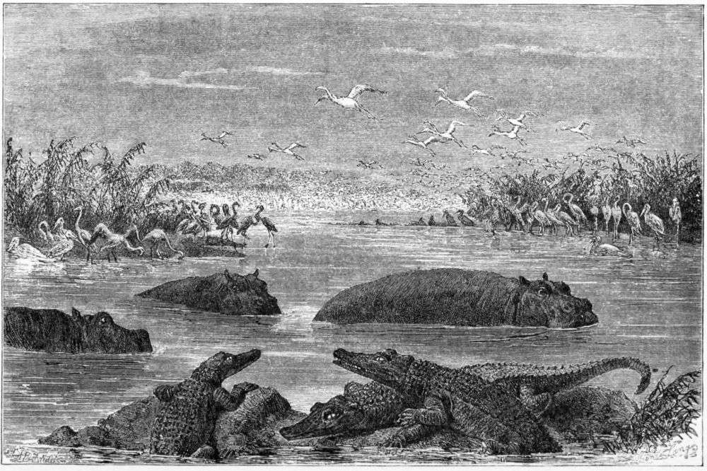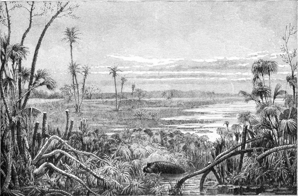 I followed the long line of men, wondering what this sindi could be. Before reaching the river-bank I saw to my astonishment that some of the men were already across, and that others apparently, as far as I could see through trees and grass, were walking on the surface of the river. When I came to the bank I found that though there was open water to the right and left of us, the surface of the stream was covered with a matted growth of papyrus and other water-plants, sufficiently thick and buoyant to support our weight in crossing, and that all our men were without hesitation trusting themselves to its seemingly treacherous surface.