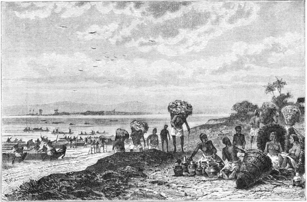 All was now life and spirit, and notwithstanding the time of night the men began dancing and singing, heedless of the hard day’s work which lay before them. Long before daylight the canoes were loaded, and we{326} pushed out into the lake and commenced coasting northwards towards Kawele. A fresh southerly breeze soon came up. We landed to cut down some bamboos, on which we spread mats and cloths; and so we extemporized some sails, which helped us on our way merrily. About two in the afternoon we passed the long red promontory formed by the mud brought down by the swift and turbulent Malagarazi, and could see the point behind which Kawele was situated. Though the breeze died away with the sun the men kept stoutly to their work, and when they at last ceased from pulling we were only half an hour from our goal. The only reason for not going on was the unseemliness in a caravan from dreaded Manyuema with wealth of ivory and slaves coming in with as little ceremony as a fishing-canoe. It was necessary that there should be firing of guns and beating of drums and waving of flags, and that the ivory should be carried up before all beholders to show the wealth Tipolo had gained by pushing his journeys so far afield.