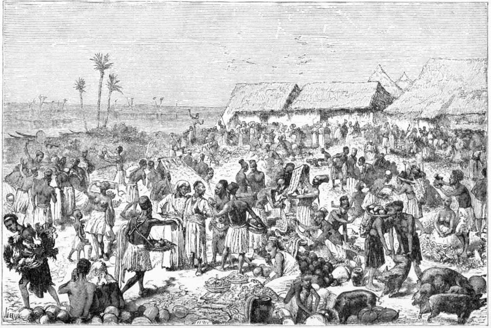 The scene was one which it was impossible to describe. There were first of all the market-people from all parts of the shores of the lake, who in the daily market held at Kawele find a sale for their goods—fish (fresh and dried), meat, ghee, fowls, eggs, hemp from Ubwari, pottery and iron from Uvira, salt from Uvinza, ivory, and slaves—each of the tribes being distinguished by varieties in tattooing, manner of hair-dressing, and shape of their weapons. Then there were the Arabs and their followers from Zanzibar, and their Wanyamwesi porters, on this occasion suspending their buying{329} and selling to welcome their friends who had indeed returned alive from Manyuema.