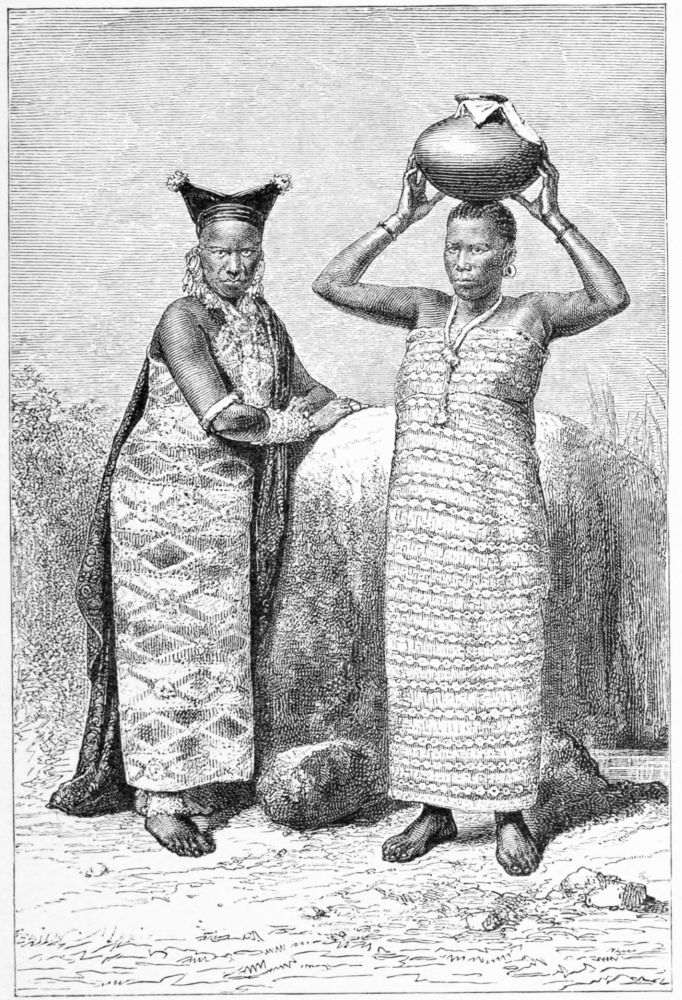 Notwithstanding this, Hatibu forced on our march, the Wanyamwesi and Zanzibar men all carrying ivory when necessary, and in an extraordinarily short time we reached the shores of Lake Tanganyika. I remember some of the names of the countries we hurried through—Uhiya, Ubudjwa, and Uguhba. Some of the people had most extravagant head-dresses, something resembling a huge chignon, made of bark, and with a piece like a tongue hanging out of the middle of it. Others disfigured themselves by perforating their upper lips and inserting in the hole a piece of circular wood or stone, which caused it to project like a duck’s bill, and which, while certainly no ornament, could have been of no manner of use. The women, apparently to make up for their lack of clothing, were most elab{318}orately tattooed in patterns which were by no means unpleasing all over the fronts of their bodies. I remember the day that I came upon streams running eastward, and I was glad at the sign that we were really making our way now towards that bourn of my hopes, the east coast of Africa. I have also a remembrance of some hot springs where all our travel-worn company enjoyed a most refreshing bath. But though I had thought myself equal to my companions in endurance, I found myself so tired at the end of each day’s march that I was glad to eat what food was provided me, and then to rest till the word was given to resume our toilsome way.