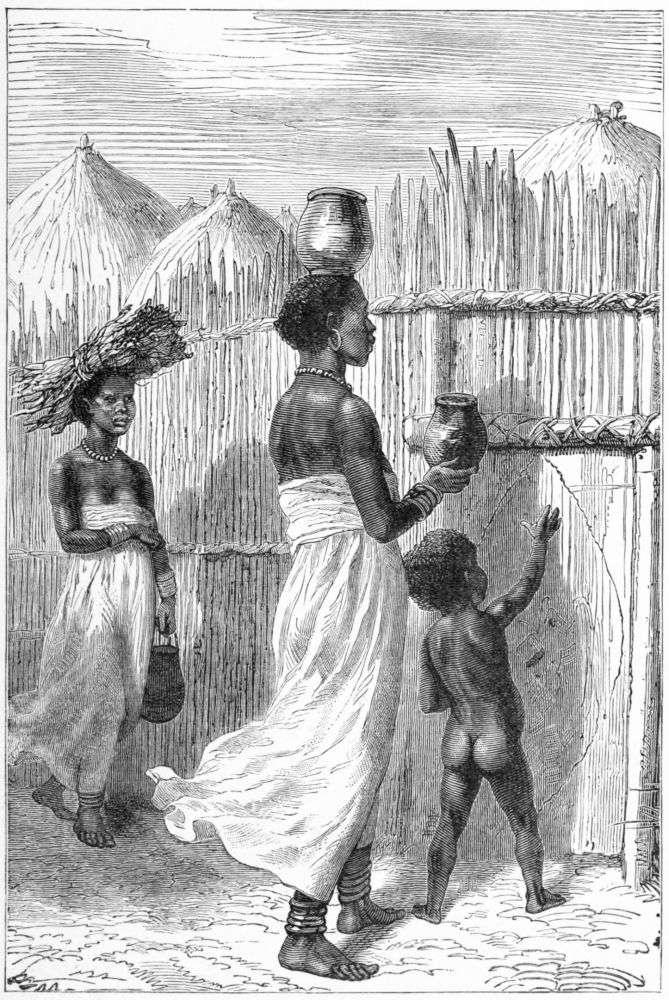 In a moment all was bustle and preparation. Sleep{342}ing men were roused, loads were lashed up and shouldered, and the mutwale being persuaded by a handsome present to open the entrance of his village, we set forth on our march.