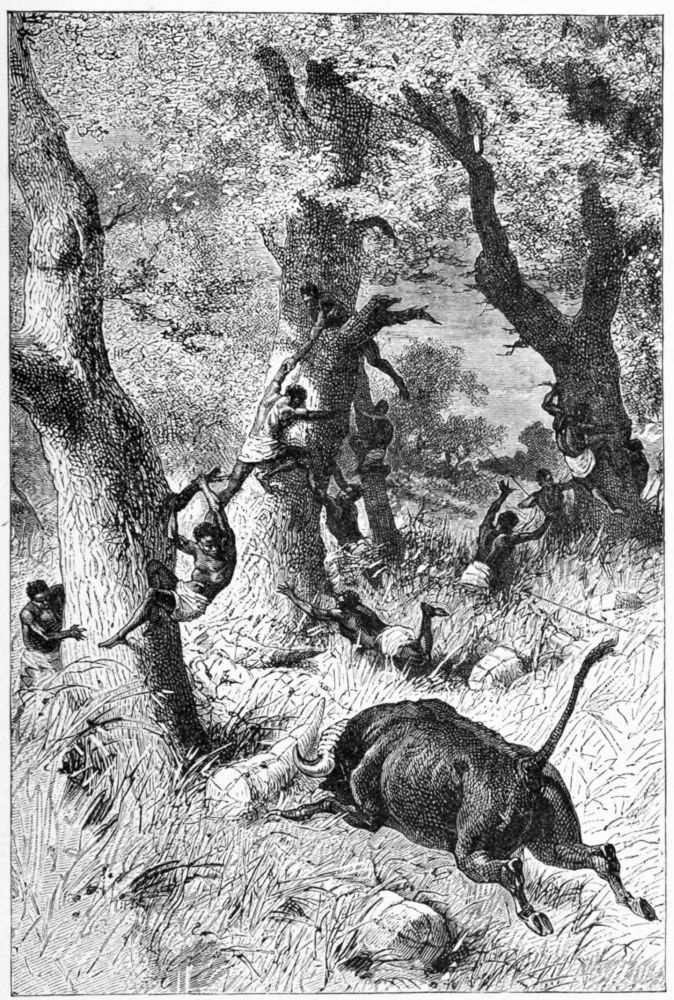 Hardly was I in the branches when I heard a rushing sound below me of the trampling of hoofs, and a buffalo bull, with head down and tail up, charged along the path we were following, tossing and goring the abandoned loads, and was soon away again. Fortunately no damage was done, and we were soon all reassembled, laughing at the figures we had made in our hasty flight. Those who had guns lamented that no use had been made of them, and the buffalo turned into account by shooting him.