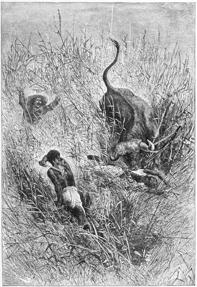 I had nothing in my hands. For a moment I thought I could do nothing; but suddenly the idea entered my head to seize the buffalo by the tail, which I did. The brute was evidently surprised and astonished at this strange attack, and turned and twisted about trying to disencumber himself of me. Though dragged off my feet, fortunately I was able to keep my grip, and the man with the hatchet dealt him several blows on the head and neck, actually succeeding in hacking off one of his horns.