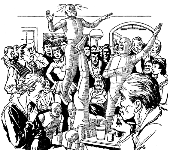 The door-announcer sang out again and again. In two hours the little apartment was jammed with human beings and inhuman androids. The interviewing process no longer involved Raymond alone. It became an interwoven, complex affair.