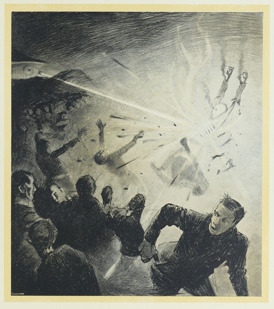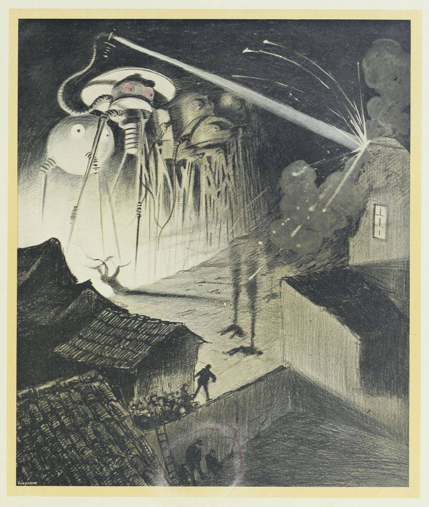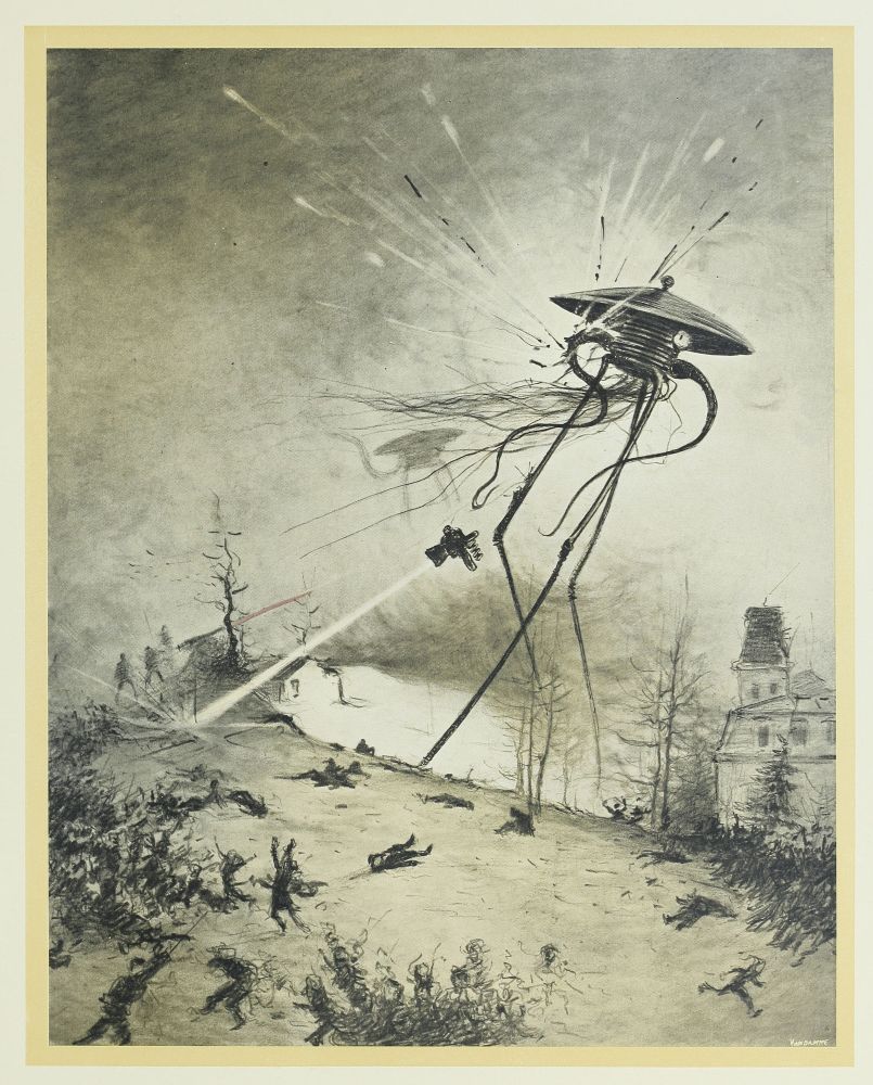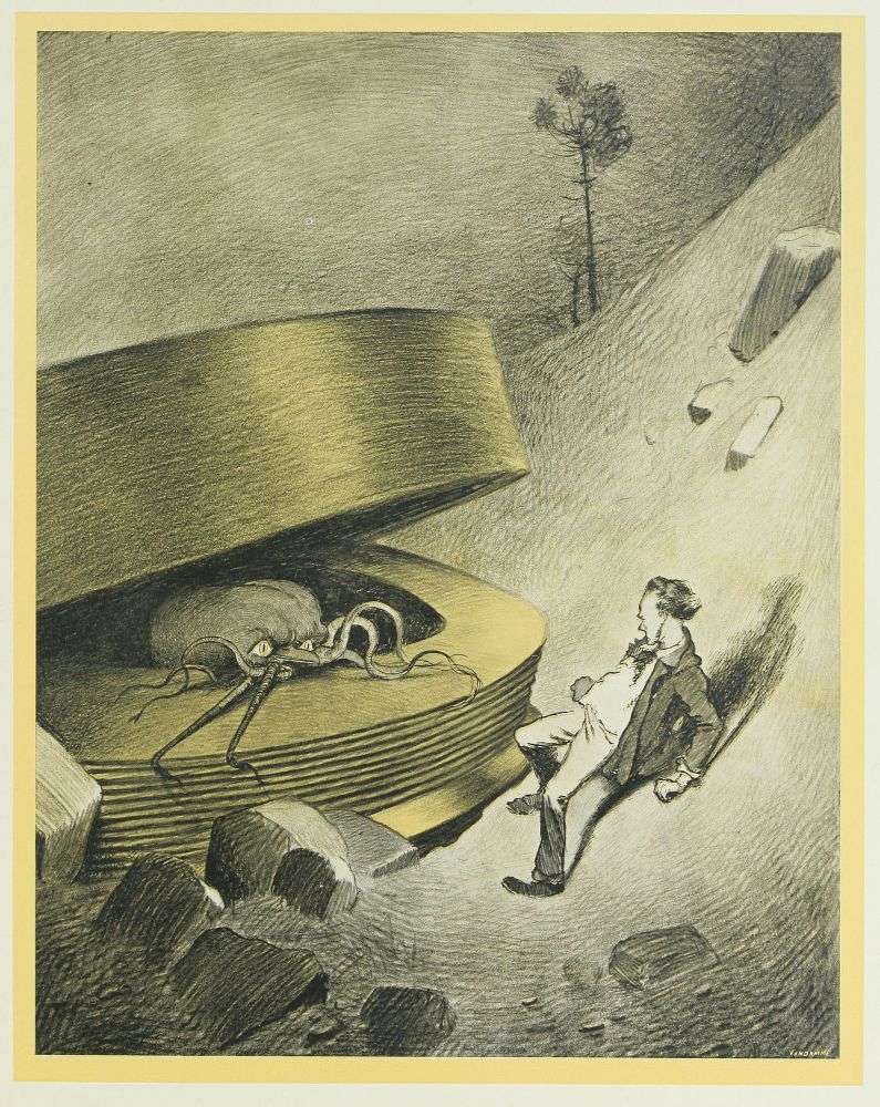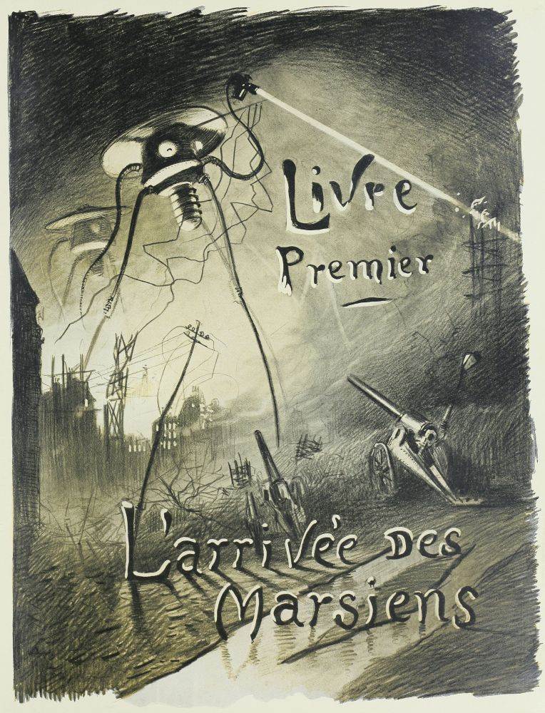 Je restais là debout, contemplant le gouffre. Soudain le soleil levant enflamma le monde de ses rayons étincelants, et mon cœur bondit de joie. La fosse était encore obscure; les formidables engins, d’une puissance et d’une complexité si grandes et si surprenantes, si peu terrestres par leurs formes tortueuses et bizarres, montaient, sinistres, étranges et vagues, hors des ténèbres, vers la lumière. J’entendais une multitude de chiens qui se battaient autour des cadavres, gisant dans l’ombre, au fond de la cavité. Sur l’autre bord, plate, vaste et insolite, était la grande machine volante qu’ils expérimentaient dans notre atmosphère plus dense, quand la maladie et la mort les avaient arrêtés. Et cette mort ne venait pas trop tôt. Un croassement me fit lever la tête, et mes regards rencontrèrent l’immense machine de guerre, qui ne combattrait plus jamais, et les lambeaux de chair rougeâtre qui pendaient des sièges des machines renversées, sur le sommet de Primrose Hill.