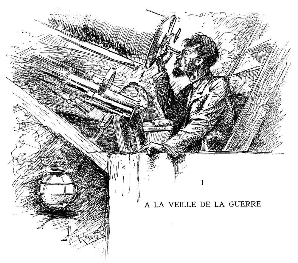 Il y a six ans maintenant que le cataclysme s’est abattu sur nous. Comme la planète Mars approchait de l’opposition, Lavelle, de Java, fit palpiter tout à coup les fils transmetteurs des communications astronomiques, avec l’extraordinaire nouvelle d’une immense explosion de gaz incandescent dans la planète observée. Le fait s’était produit vers minuit et le spectroscope, auquel il eut immédiatement recours, indiqua une masse de gaz enflammés, principalement de l’hydrogène, s’avançant avec une vélocité énorme vers la terre. Ce jet de feu devint invisible un quart d’heure après minuit environ. Il le compara à une colossale bouffée de flamme, soudainement et violemment jaillie de la planète “comme les gaz enflammés se précipitent hors de la gueule d’un canon”.