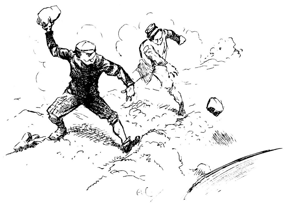 Quatre ou cinq gamins assis au bord du trou, les jambes pendantes, s’amusaient—jusqu’à ce que je les eusse arrêtés—à jeter des pierres contre la masse géante. Après que je leur eus fait des remontrances, ils se mirent à jouer à “chat” au milieu du groupe de curieux.