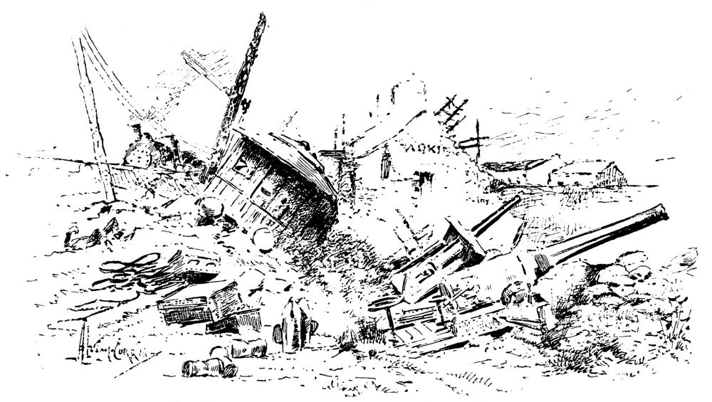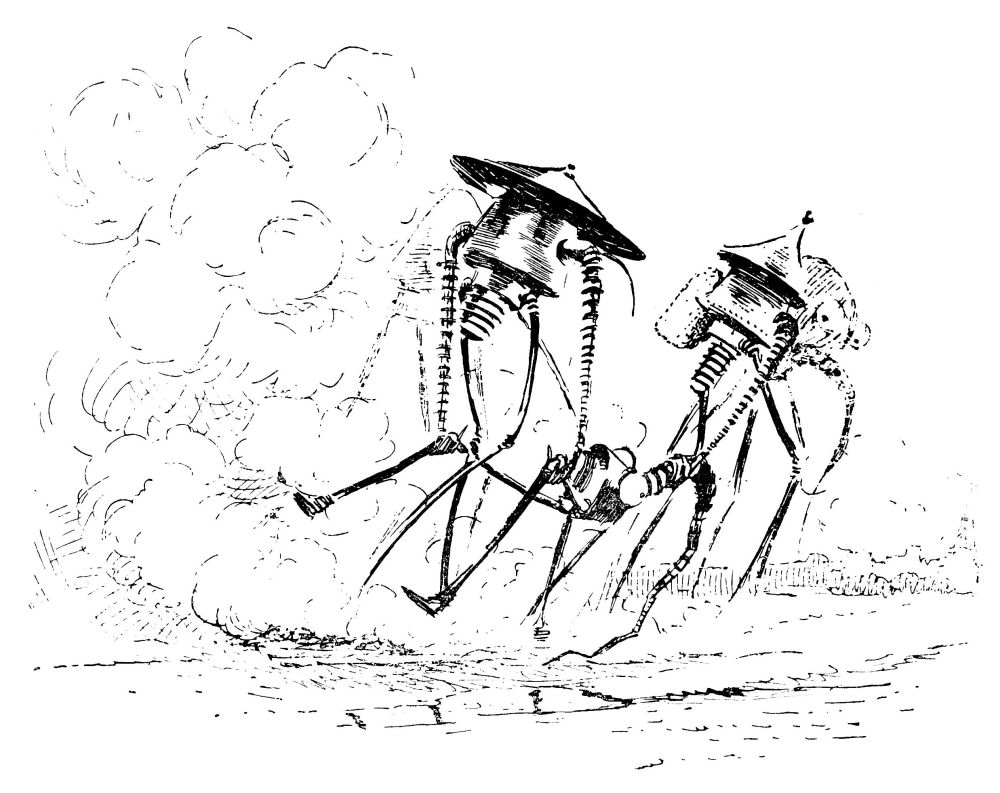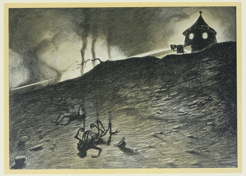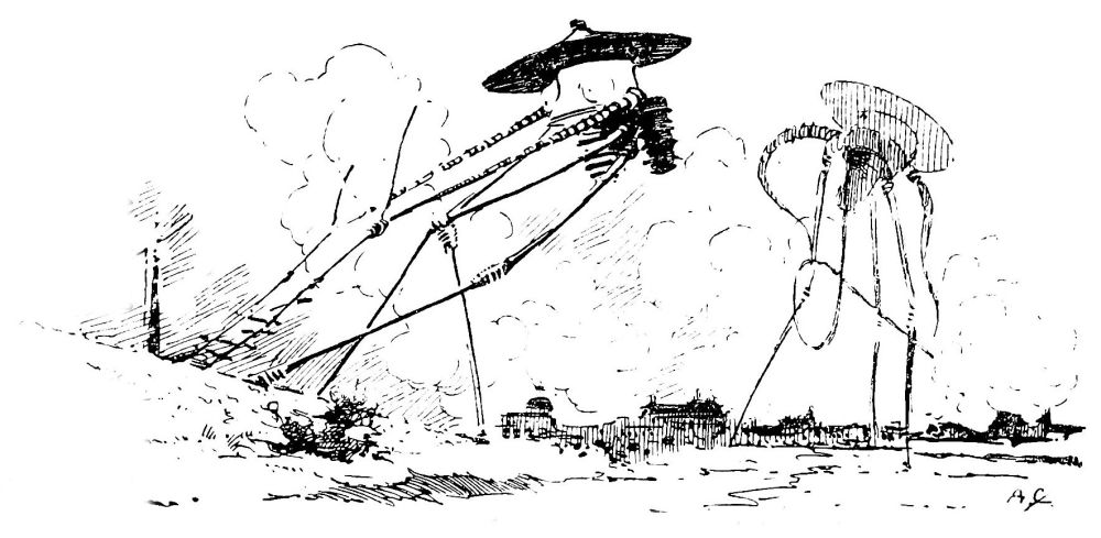 ... je pus voir l’intérieur de la redoute; c’était un vaste espace où gisaient, en désordre, des mécanismes gigantesques, des monceaux énormes de matériaux et des abris d’une étrange sorte. Puis, épars çà et là, quelques-uns dans leurs Machines de Guerre renversées ou dans les Machines à Mains, rigides maintenant, et une douzaine d’autres silencieux, roides et alignés, étaient les Marsiens—«morts»...
